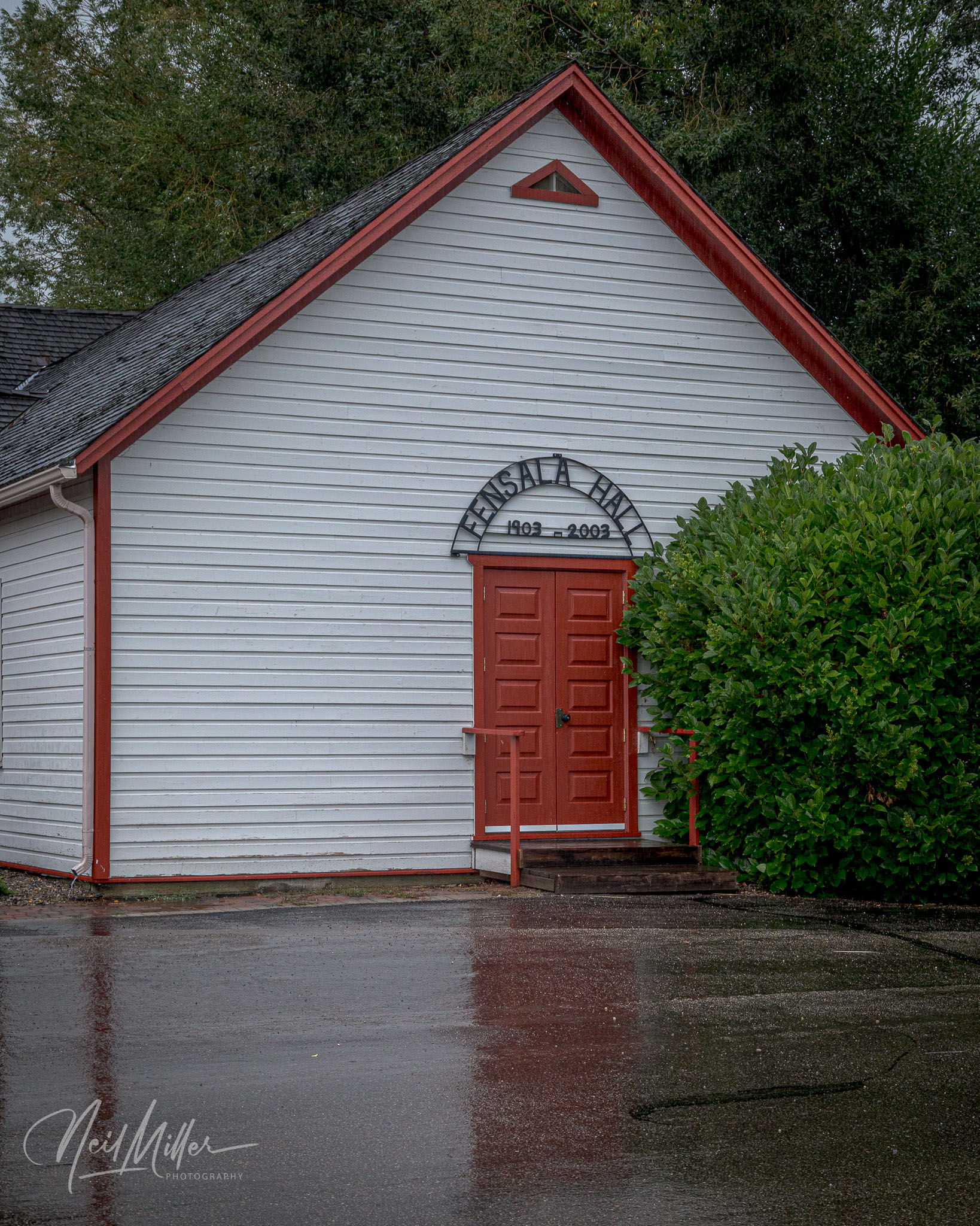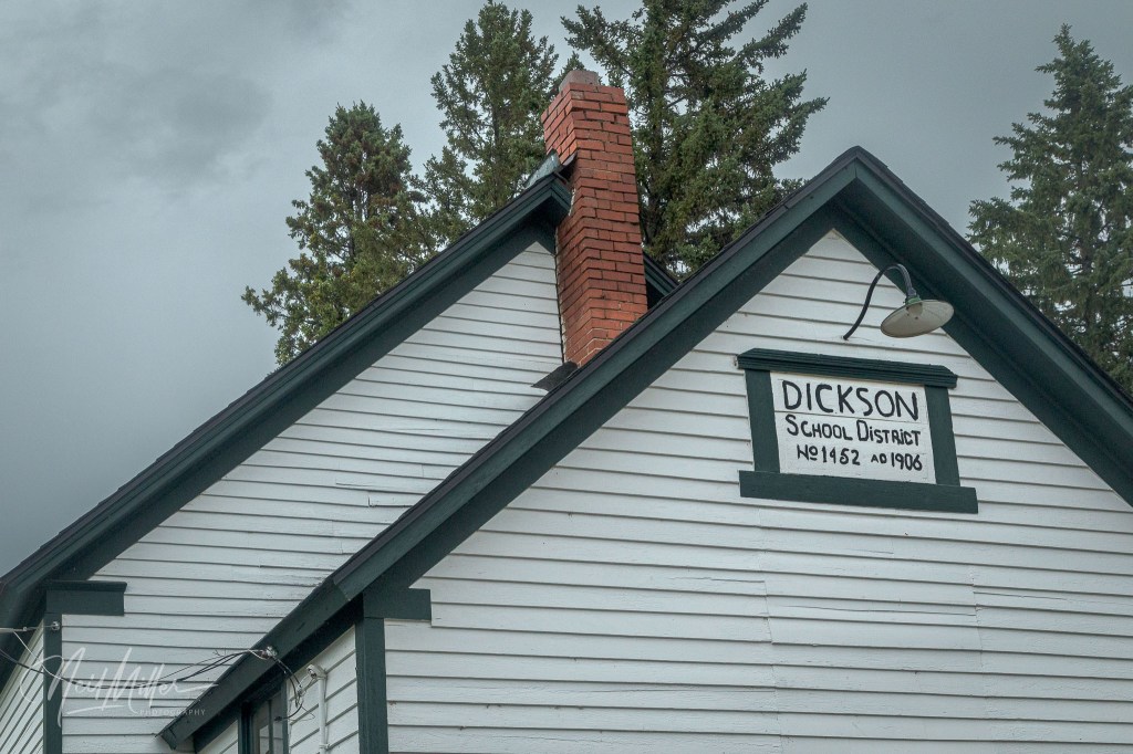 Both David and I tend to mount our cameras on tripods whenever practical when taking photos. However, with rain pelting down at our first stop, the Hamlet of Markerville, we shot hand-held. Basically we stopped the car in front of the building, jumped out, composed our shot, pressed the shutter and jumped back into the car.
