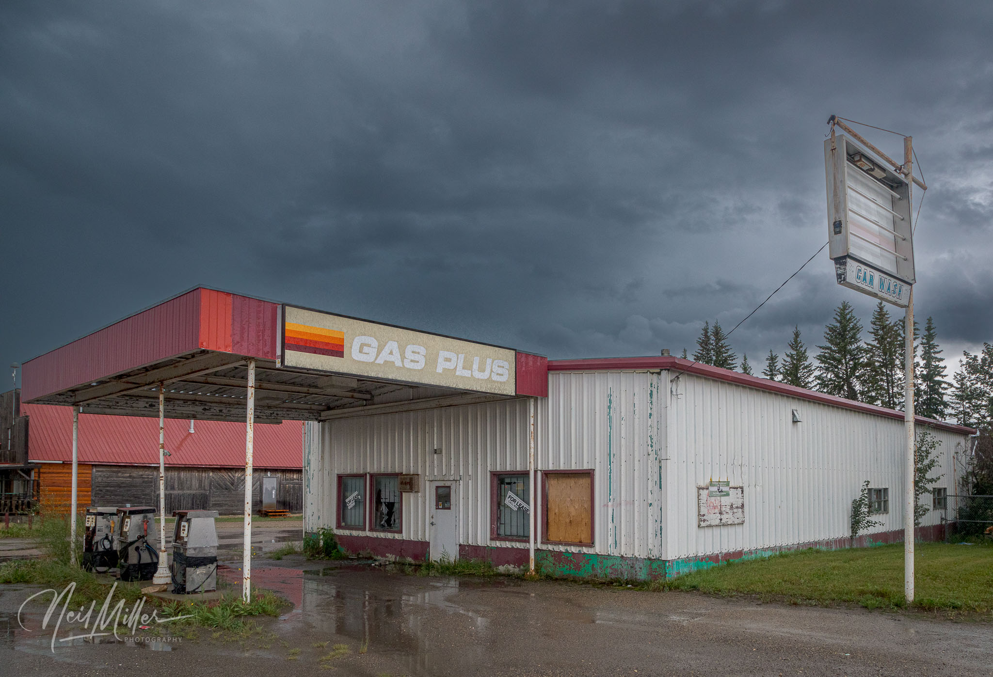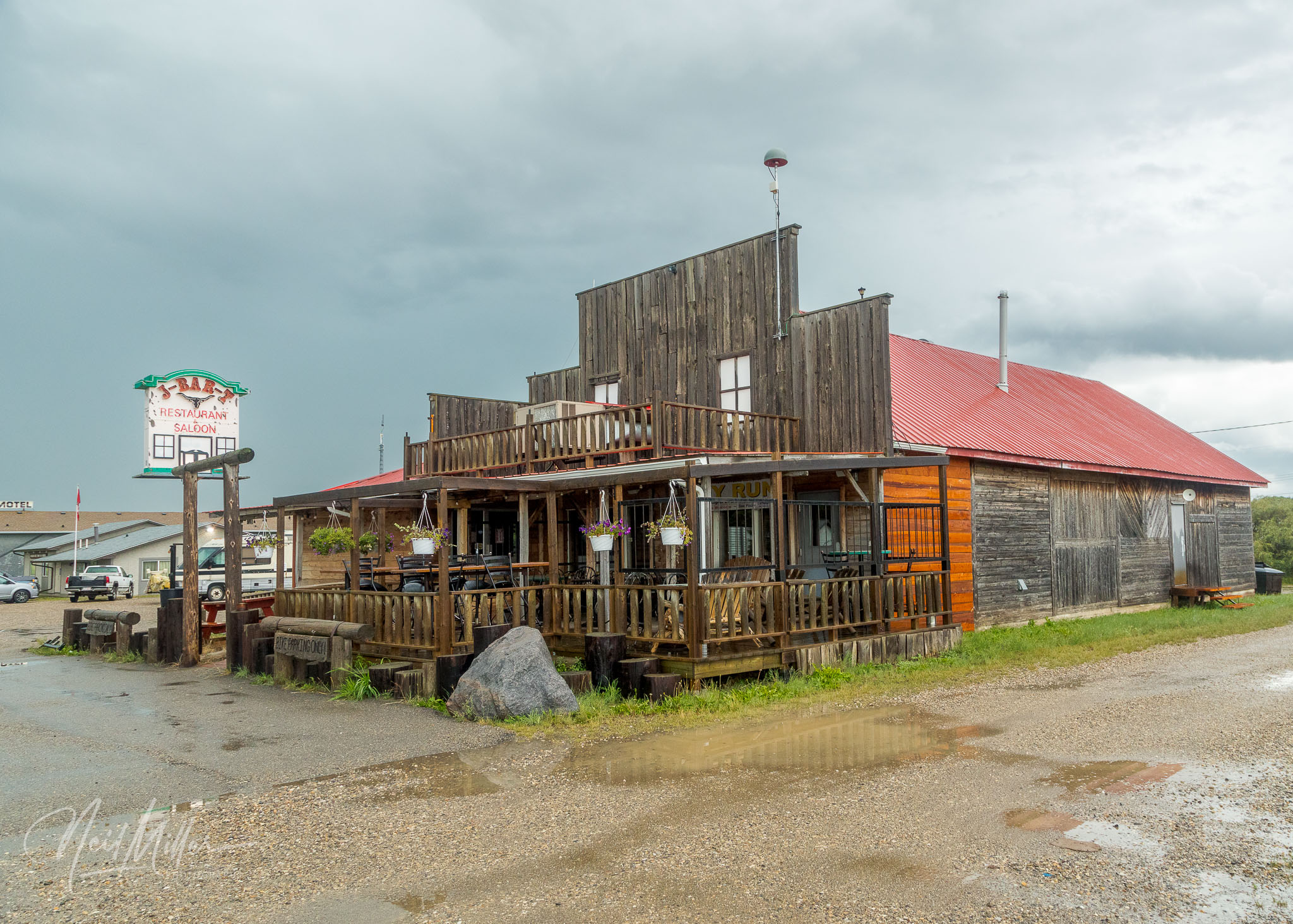 A short drive from Markerville is Spruce View, a tiny hamlet located on Highway 54 southwest of Red Deer. Again, due to rain, our stop was brief: long enough to photograph an old gas station and a bar next door.