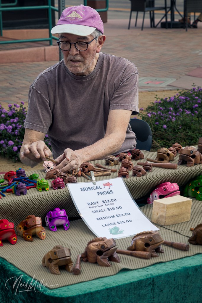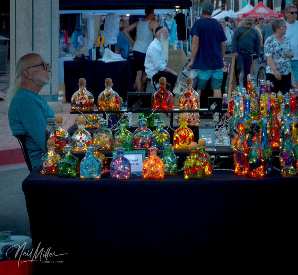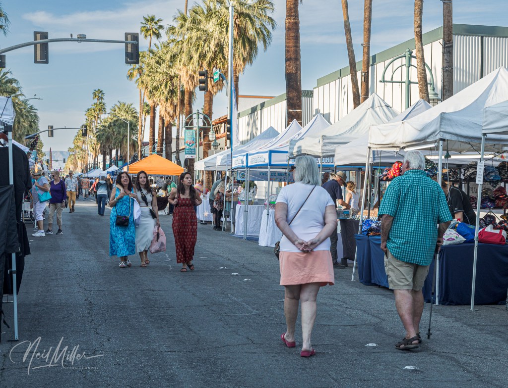 Every Thursday night, a stretch, several blocks long, of downtown Palm Springs, CA is converted to an outdoor market. A wide variety of crafts, artwork, and services are offered along with a number of food concessions. With this being the height of snowbird season, the market was quite busy when I recently attended with my camera.