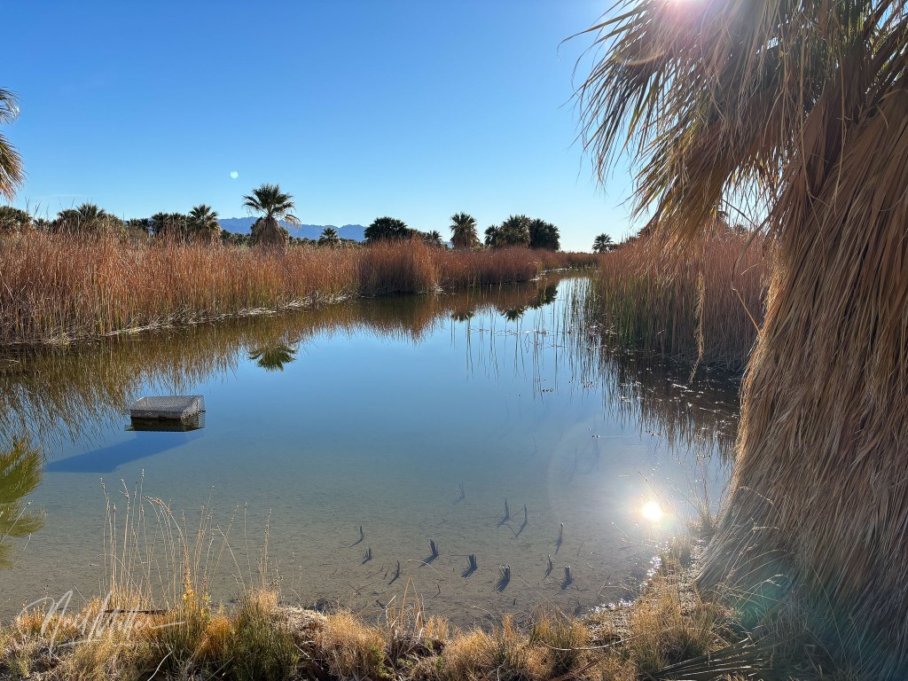 The final hike I will cover in Part 1 is the Dos Palmas Preserve, east of the Salton Sea. A series of ponds, fed by artesian wells and leakage from the Coachella Canal form a wetland surrounded by palms and other vegetation. I have visited the Preserve several times and it is a beautiful area just to wander around. Sadly, in mid-February, a controlled burn went out of control and the resulting wildfire burned much of the Preserve. The photos below were taken just over a month before the fire. I have not been there since to see how much damage was done.