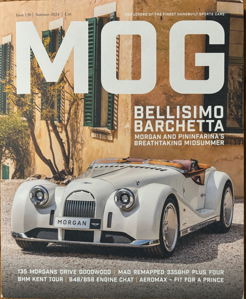 MOG Magazine is a publication for Morgan sportscar owners (Morgan Owners Group). The Morgan Motor Company has been building cars in Worcestershire, UK since 1910. Their cars are hand built, featuring an aluminum chassis, wooden frame and aluminum body. They make both 3-wheel and 4-wheel sports cars. Check them out at https://morgan-motor.com/