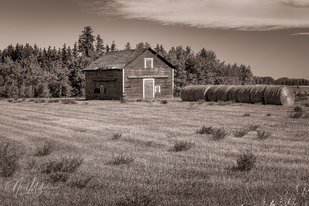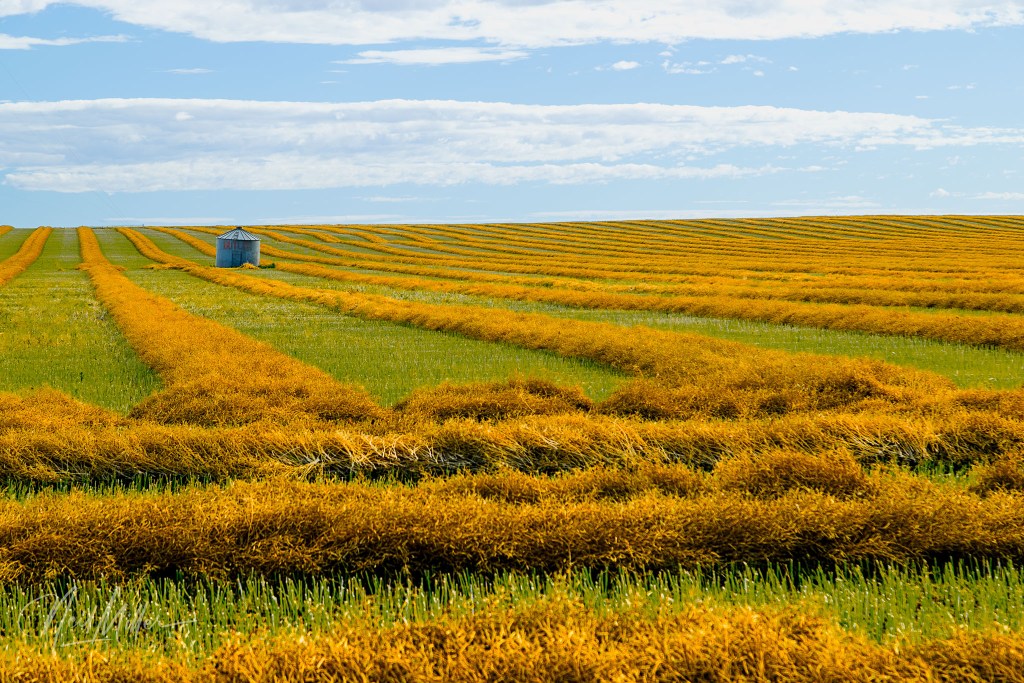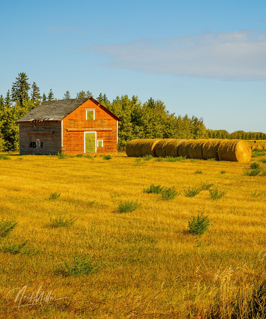 My drive continued past farm fields with golden windrows contrasted against green grass and red granaries.