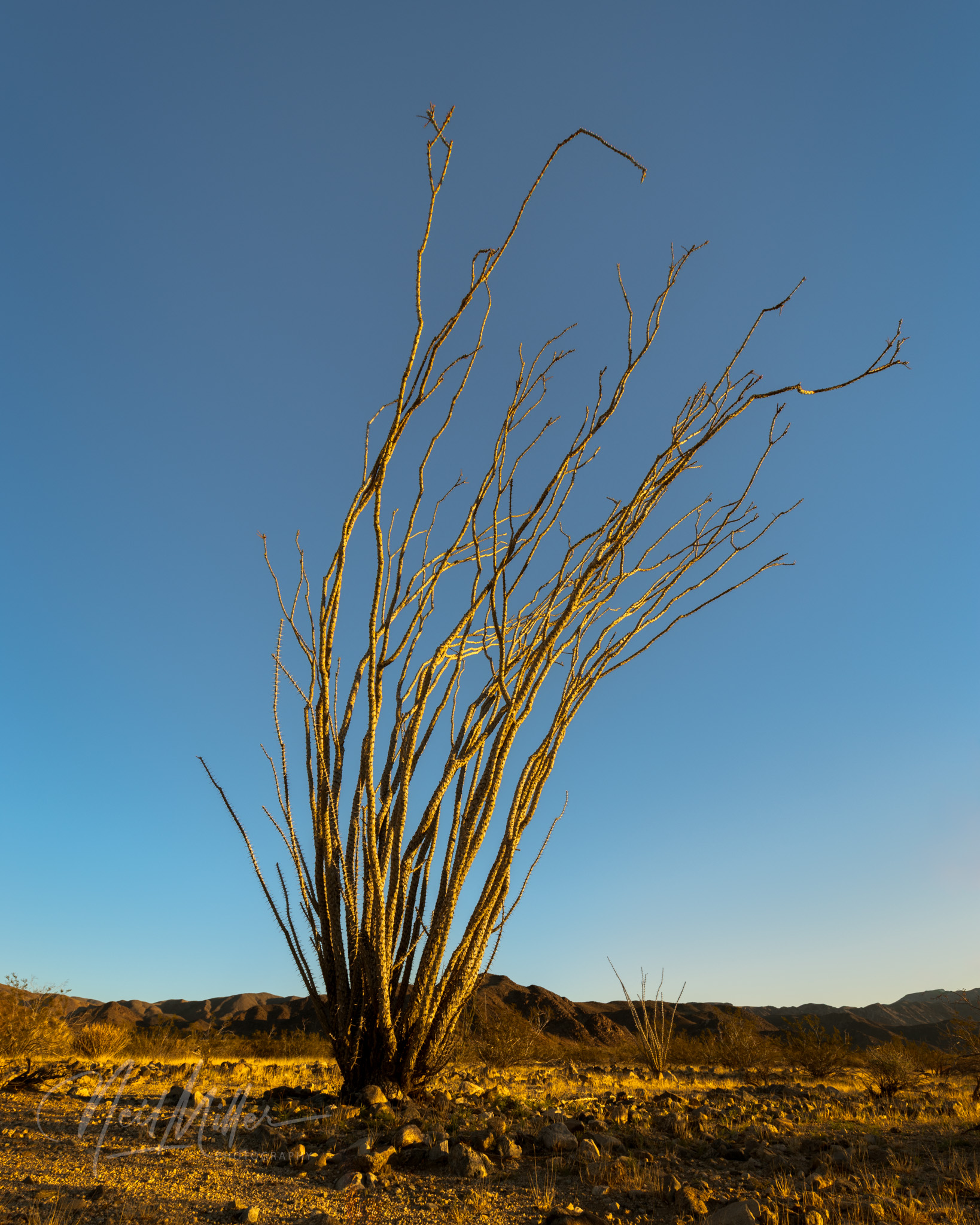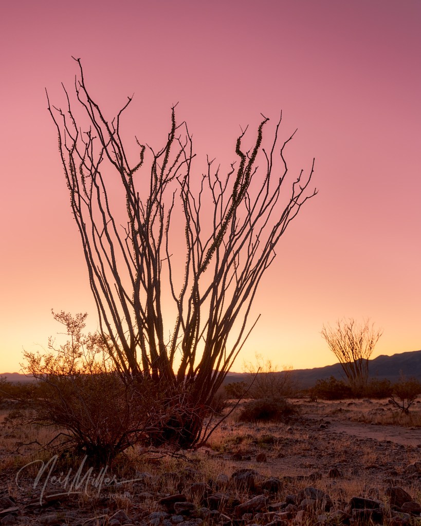 On the first visit, a friend and I arrived, in an area that contains an abundance of Ocotillos, a little before sunrise. While the sun was still below the horizon, the sky lit up with some beautiful gold and pink colors. As always, click on any image to see a full size version of the photo.