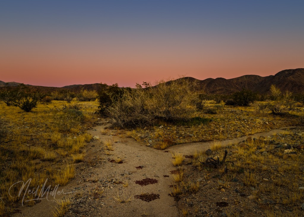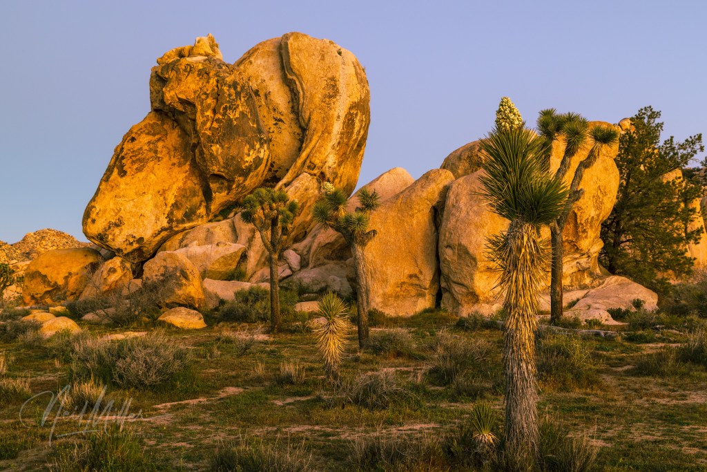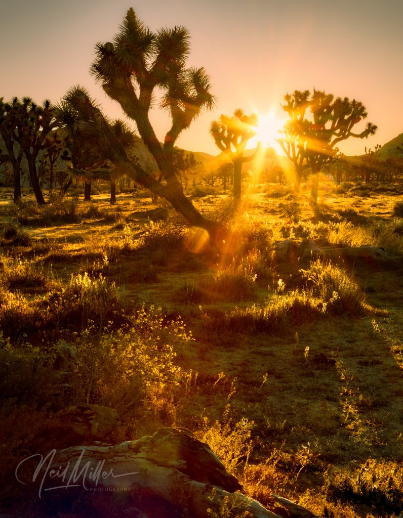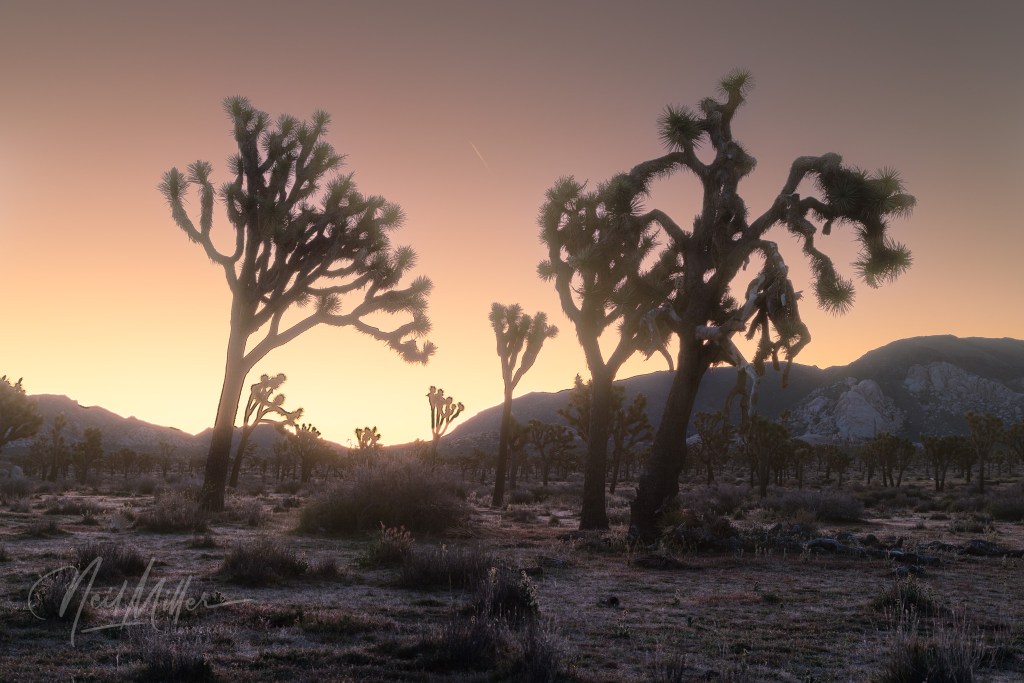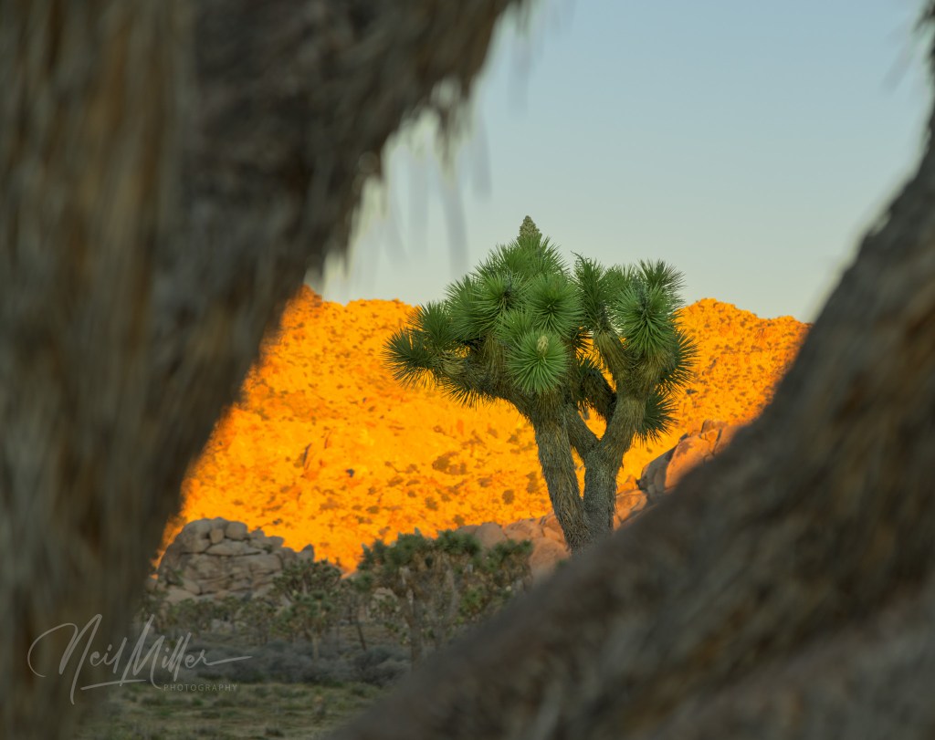 Following sunrise, we spent some time photographing other desert scenes. It is not difficult to find subject matter to photograph in JTNP! Working clockwise around the gallery is first an Ocotillo standing tall against the blue sky. Then, a cholla cactus is backlit by the sun, while below it a snag contrasts nicely with the textures that surround it. The final two images are smoke trees. As their name implies, the foliage on these trees appear like clouds of smoke.