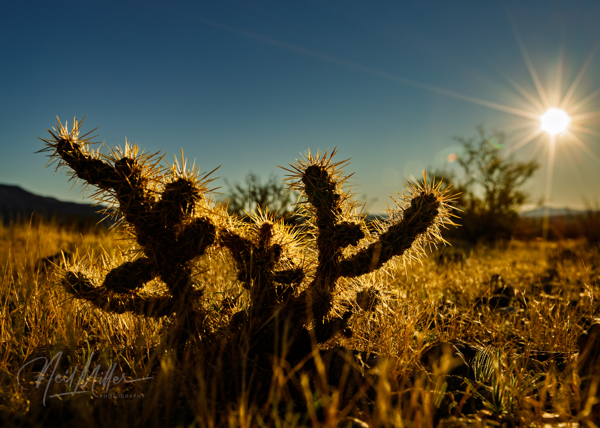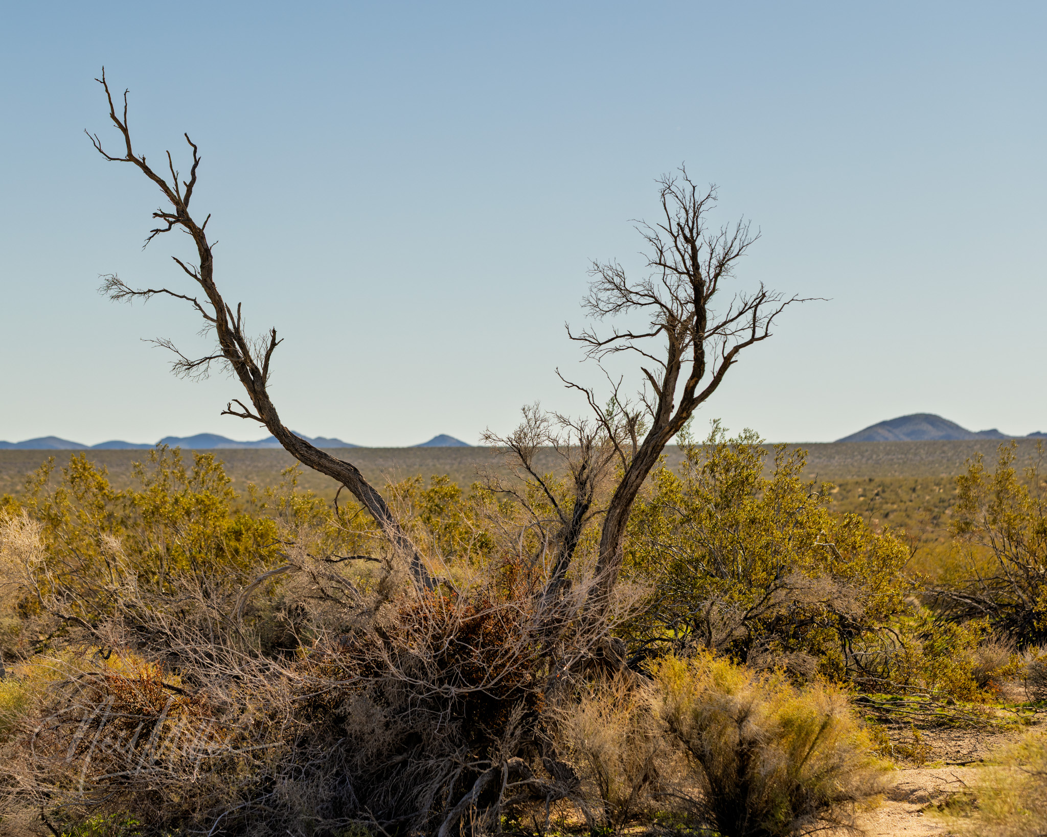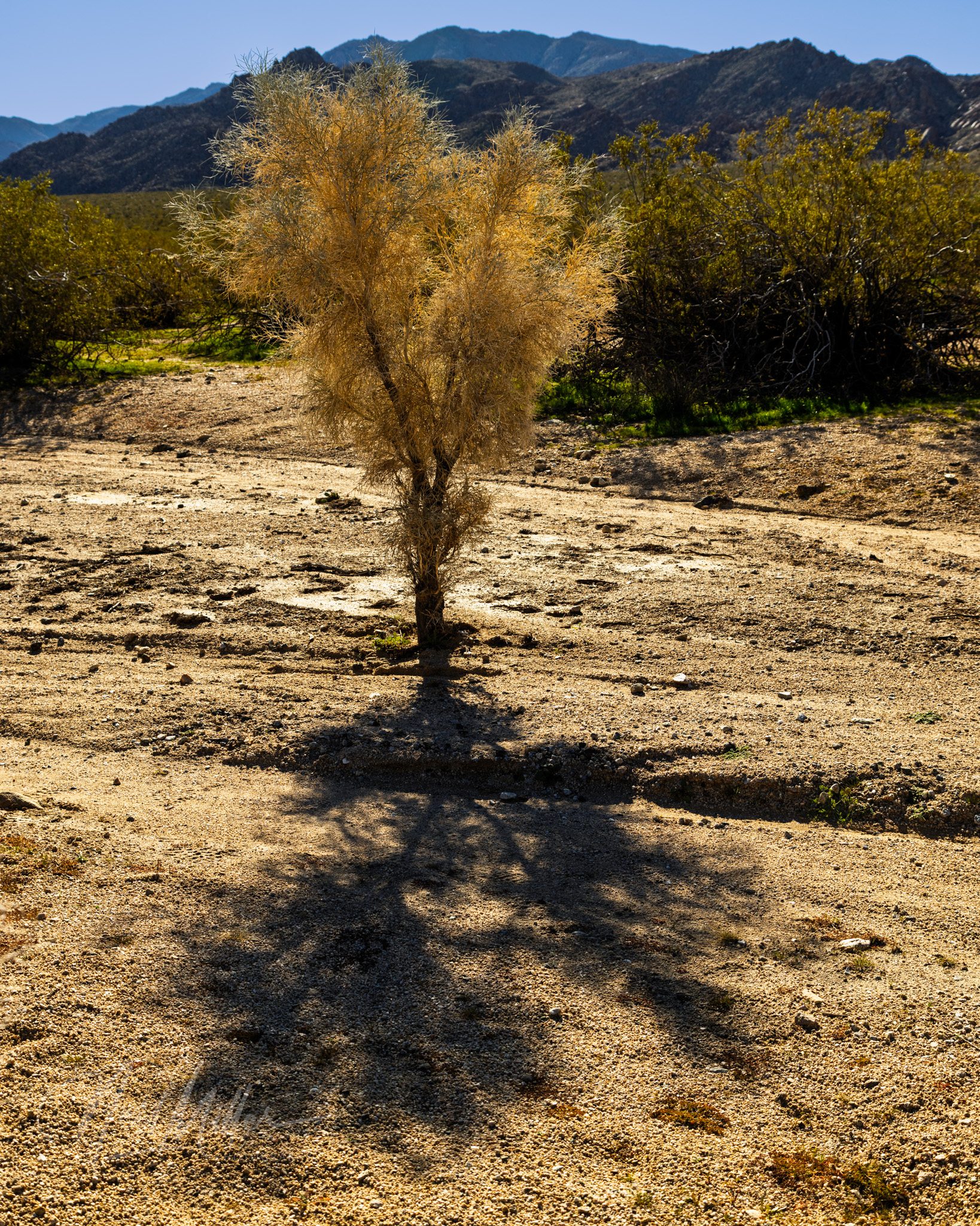 Following sunrise, we spent some time photographing other desert scenes. It is not difficult to find subject matter to photograph in JTNP! Working clockwise around the gallery is first an Ocotillo standing tall against the blue sky. Then, a cholla cactus is backlit by the sun, while below it a snag contrasts nicely with the textures that surround it. The final two images are smoke trees. As their name implies, the foliage on these trees appear like clouds of smoke.