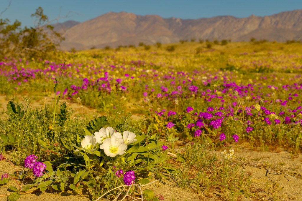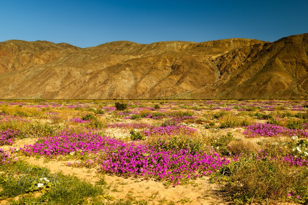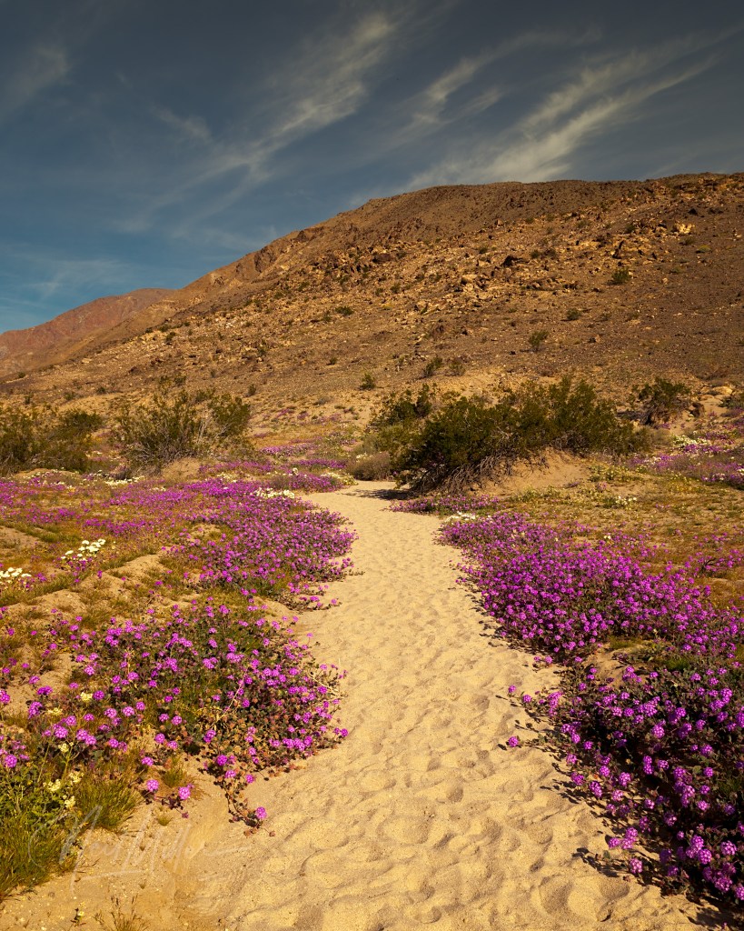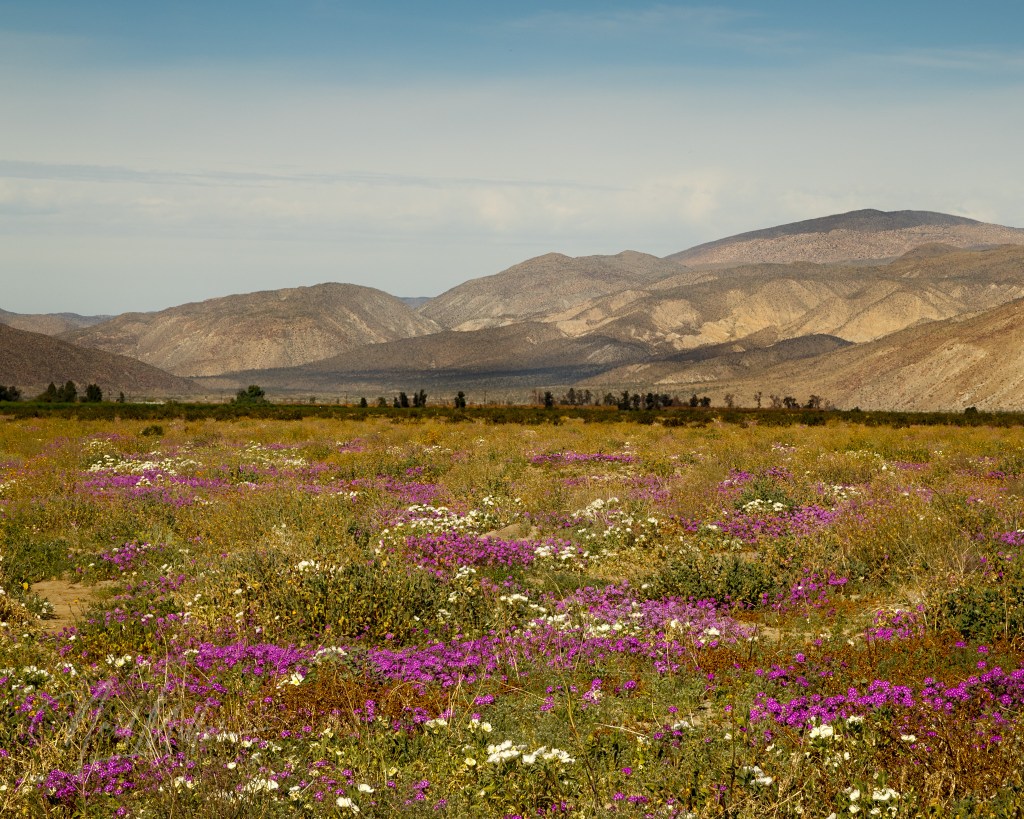 Just to start things off, here are some broader scenes. Keen-eyed observers will recognize these as having been taken in Anza Borrego State Park. Featured prominently are the purple Desert Sand-verbena.