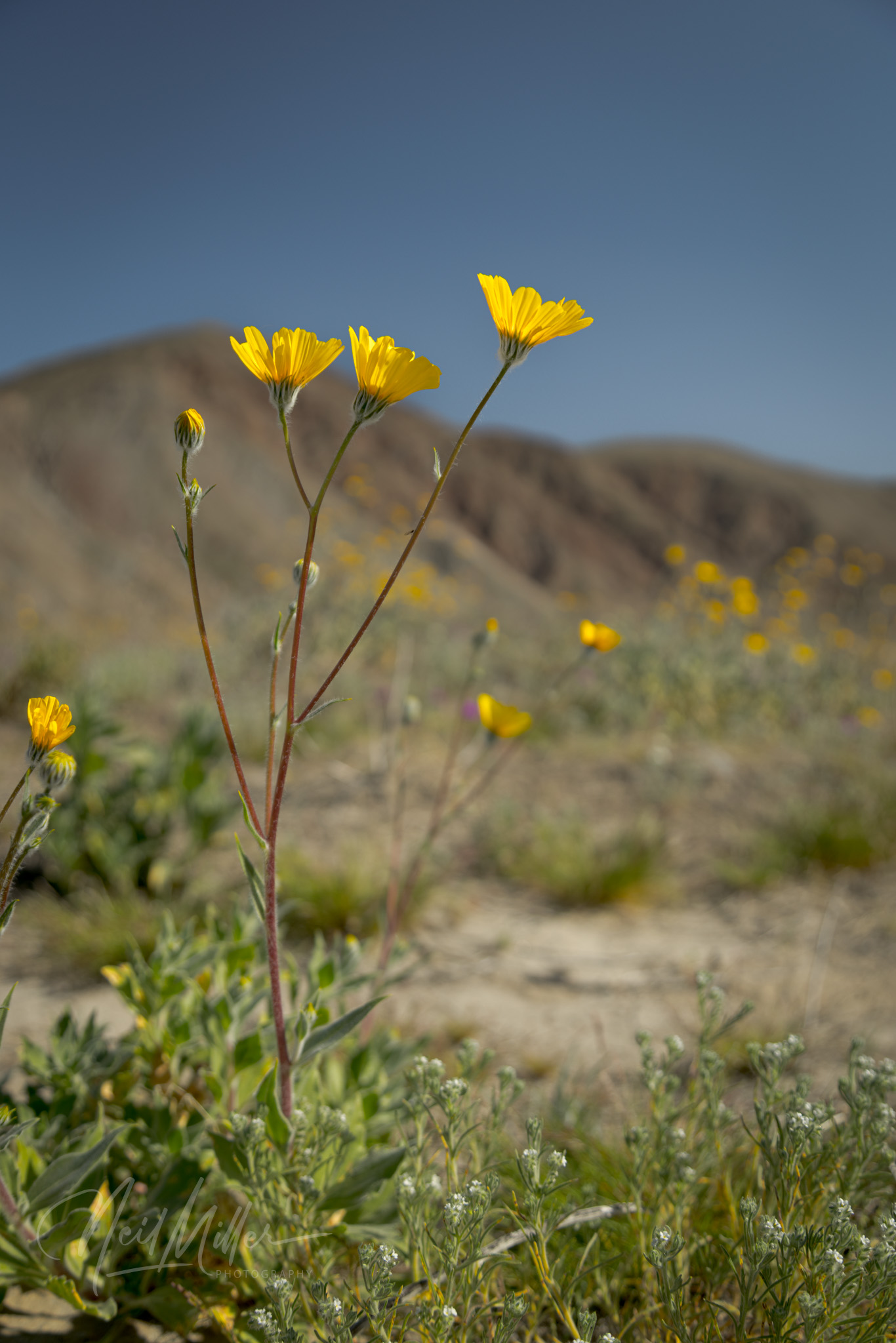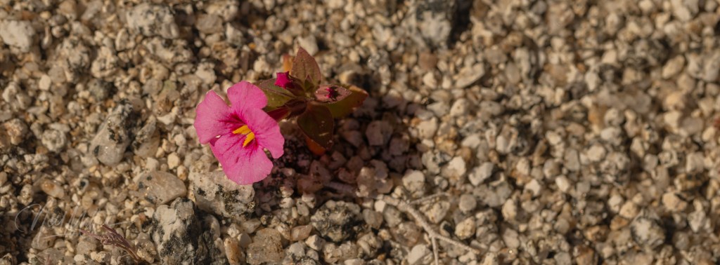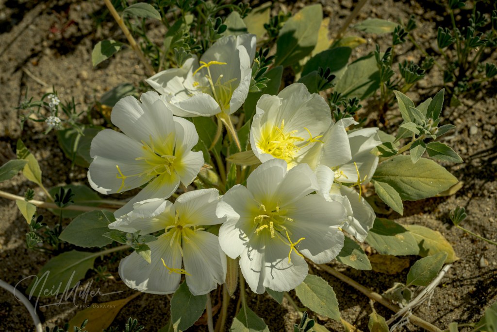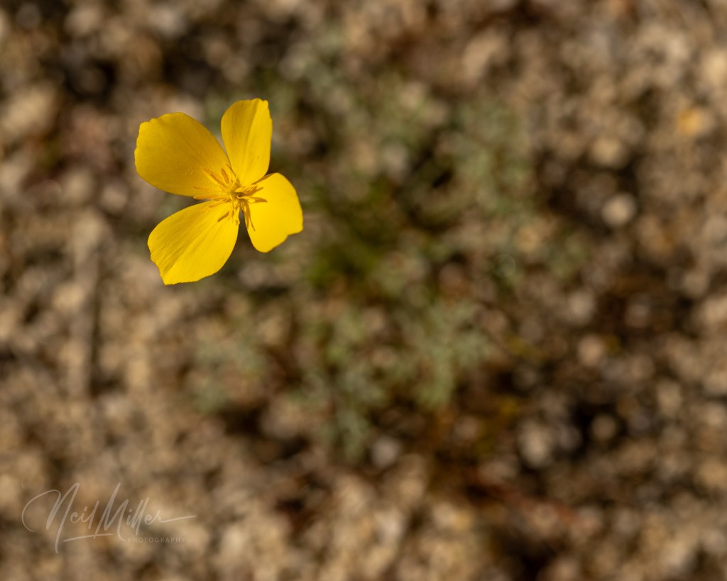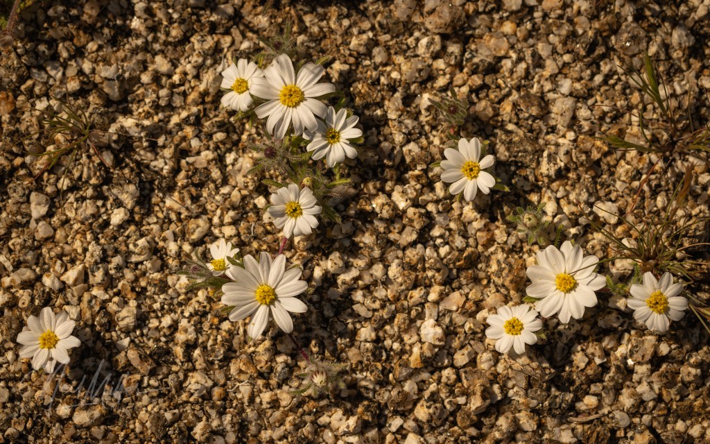 Growing very low to the ground are the yellow Desert Goldpoppy, the white Mohave Desertstar, and the pink Bigelow’s Monkeyflower.